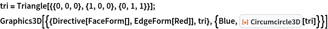Graphics3D[{{Directive[FaceForm[], EdgeForm[Red]], tri}, {Blue, ResourceFunction["Circumcircle3D"][tri]}}]