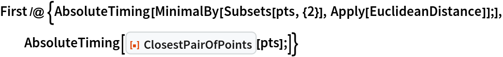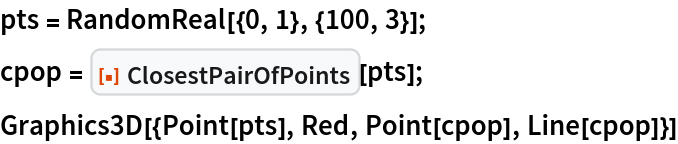 ResourceFunction["ClosestPairOfPoints"][{p1,p2,p3,…}] finds the pair of points from pi that are closest to each other. | |