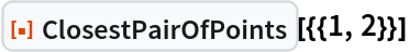 ResourceFunction["ClosestPairOfPoints"][{p1,p2,p3,…},"Association"] returns an Association with the indices of the points, the points and the distance. |