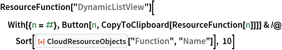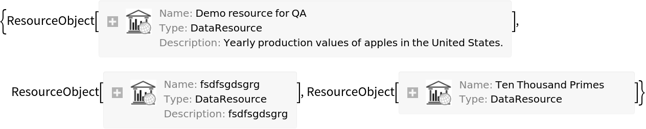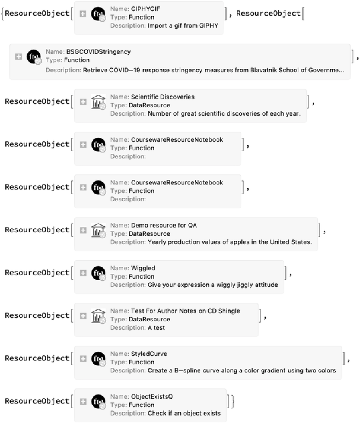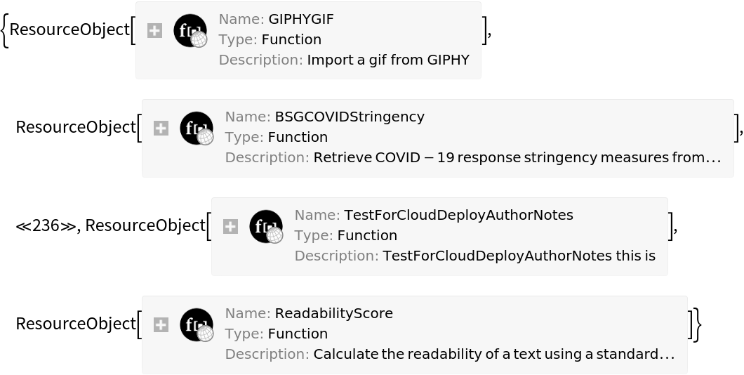 ResourceFunction["CloudResourceObjects"][] returns a list of all resource objects deployed to the authenticated user's cloud account. | |