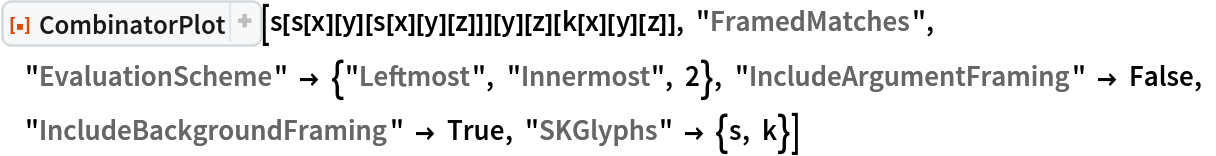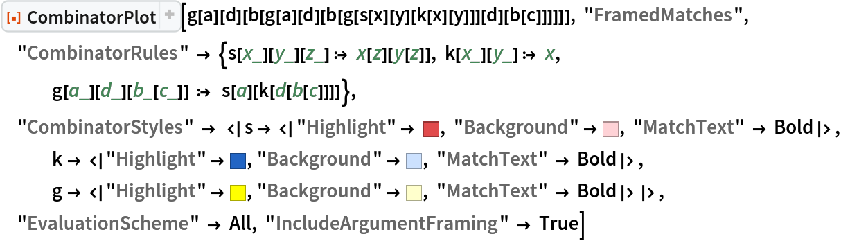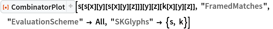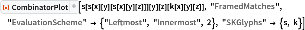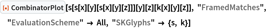 ResourceFunction["CombinatorPlot"][cmb,"FramedMatches"] highlights rule matches in the combinator expression cmb. | |