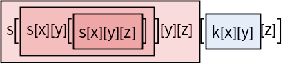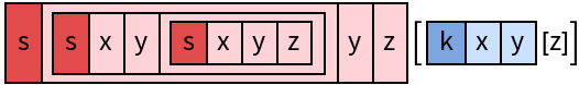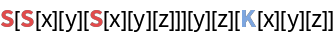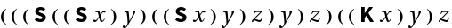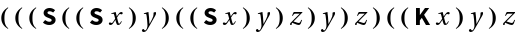 Display a combinator expression in traditional form with right-associative application, combinator glyphs, and styled brackets: