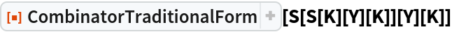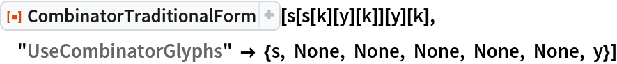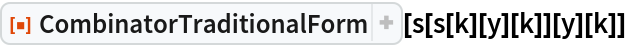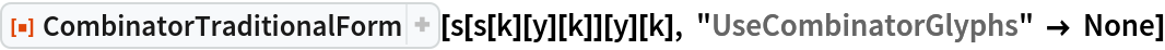 ResourceFunction["CombinatorTraditionalForm"][cmb] display the combinator expression cmb in left-associative parenthetical form with no application glyph. |