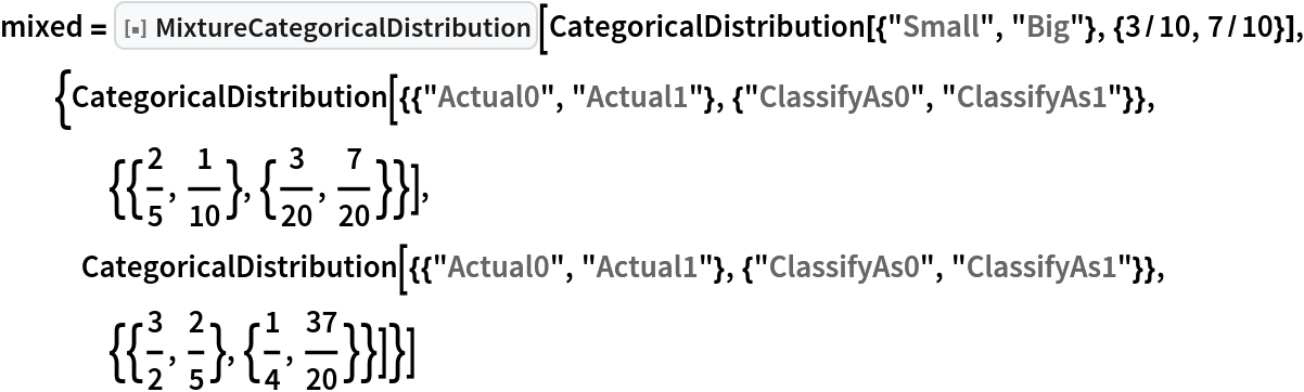Now synthesize a randomized controlled trial and derive the interventional distribution when one forces the treatment to be "A" by computing a MixtureCategoricalDistribution over stone size in which the components are the conditional categorical distributions based on the stone size and the treatment being A: