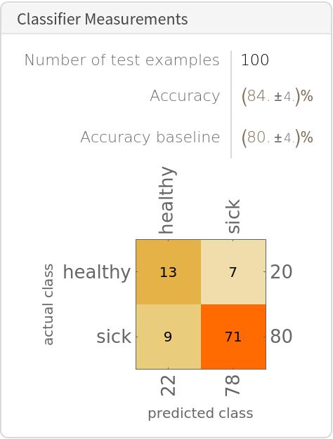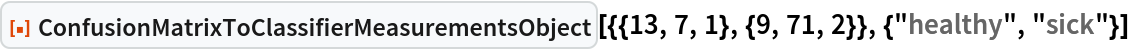 Create a ClassifierMeasurementsObject out of a confusion matrix where the classes are "healthy" and "sick":
