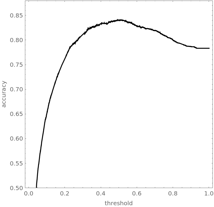 Plot the accuracy of the classifier over the threshold levels for each of the folds: