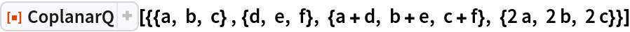 ResourceFunction["CoplanarQ"][{list1, list2, …}] returns True if the set of points determined by listi lies in a plane. |