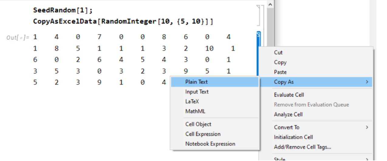 To copy the data (again) from the output cell, use the Copy As -> Plain Text functionality: