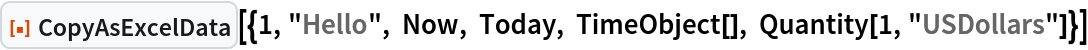 ResourceFunction["CopyAsExcelData"][list] copies list to the clipboard in plain-text (TSV) form so that it can be pasted into Excel and most other spreadsheets. |