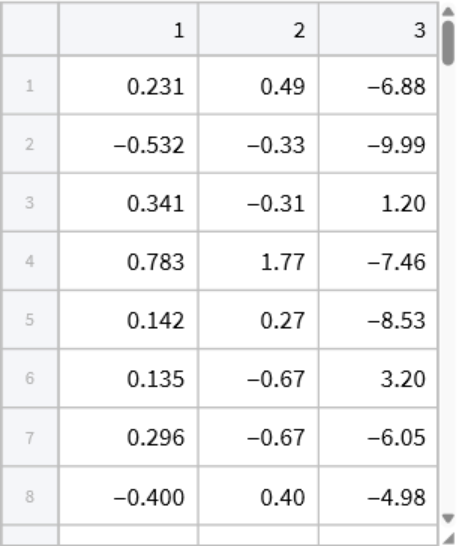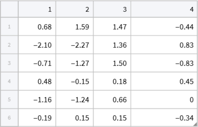 tab = Tabular[{{0.68, 1.59, 1.47, -0.44}, {-2.1, -2.27, 1.36, 0.83}, {-0.71, -1.27, 1.5, -0.83}, {0.48, -0.15, 0.18, 0.45}, {-1.16, -1.24, 0.66, 0}, {-0.19, 0.15, 0.15, -0.34}}]