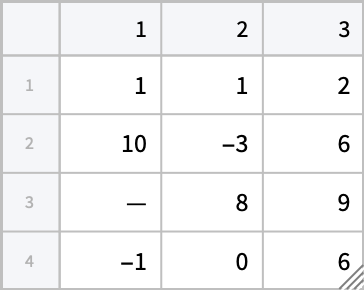 data = Tabular[{{1, 1, 2}, {10, -3, 6}, {Missing[], 8, 9}, {-1, 0, 6}}]
