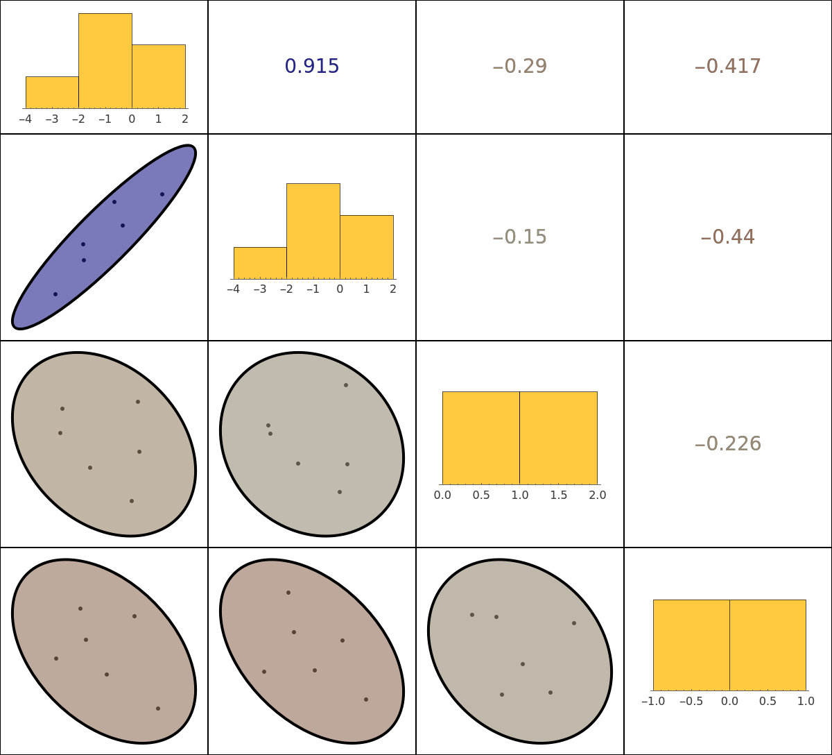 "CorrelationChart"][{{1, 2, -1, 1}, {2, 9, -8, 5}, {-1, 3, 1, 4}, {11, 8, 3, 6}, {0, 1, 8, 7}}, "NumericalValues" -> False]