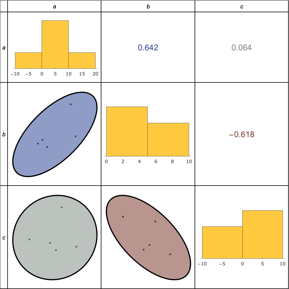 "CorrelationChart"][{{1, 2, -1}, {2, 9, -8}, {-1, 3, 1}, {11, 8, 3}, {0, 1, 8}}, ChartLabels -> {"a", "b", "c"}]