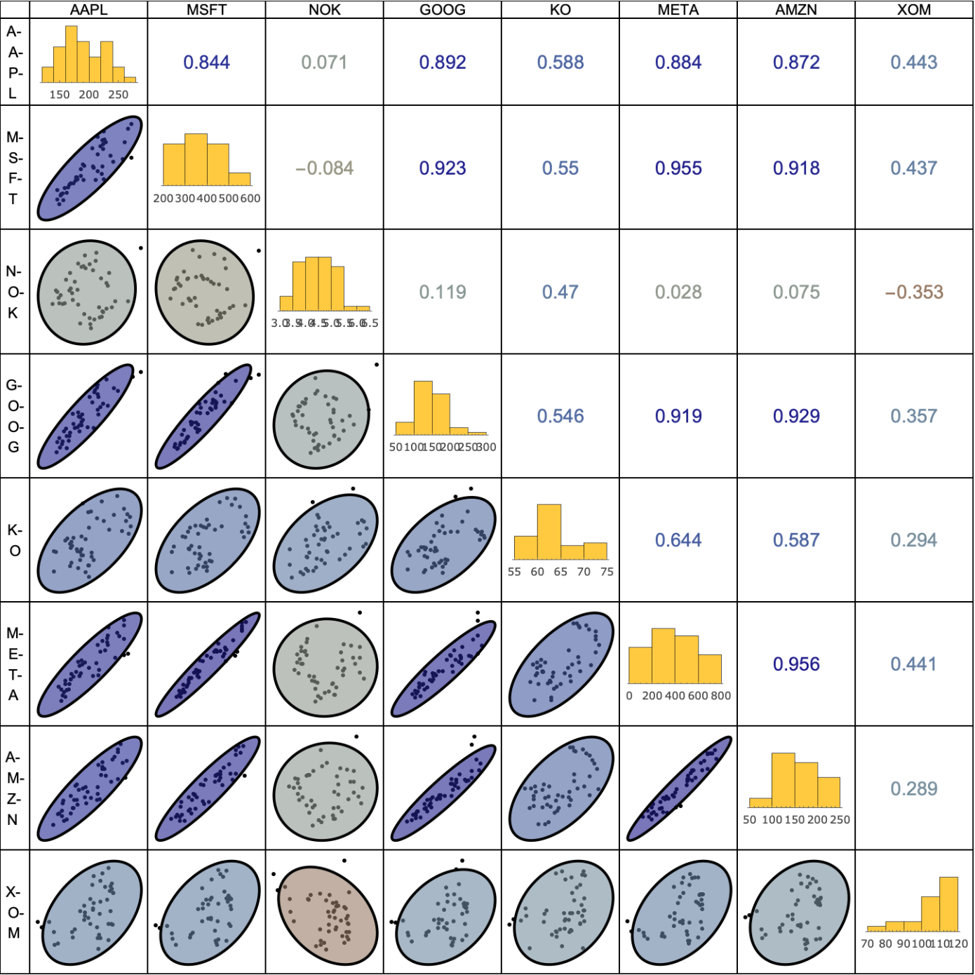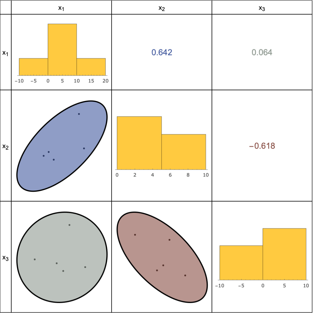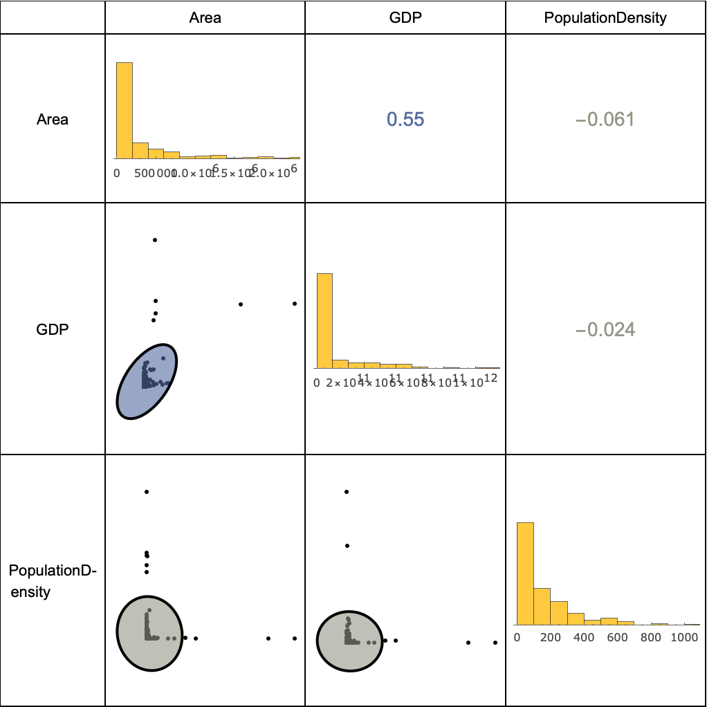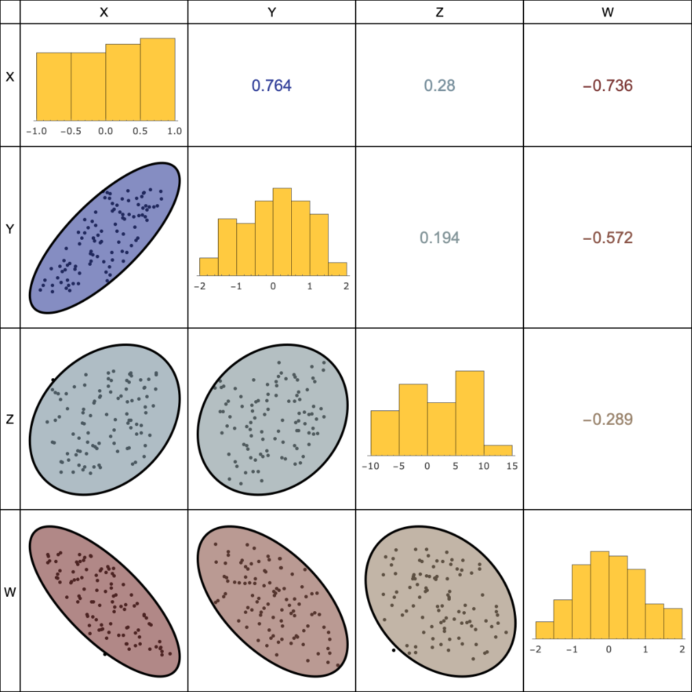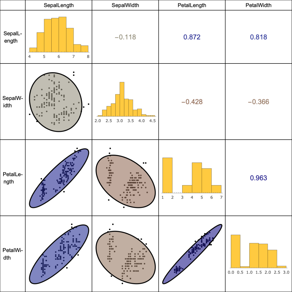 ResourceFunction["CorrelationChart"] shows how different variables in data correlate to each other. Plots in the lower triangle display Ellipsoid objects centered at the mean of the corresponding variable pair, diagonal plots display a Histogram of the individual variable and the upper triangle shows, by default, the numerical values of the pairwise correlation.
