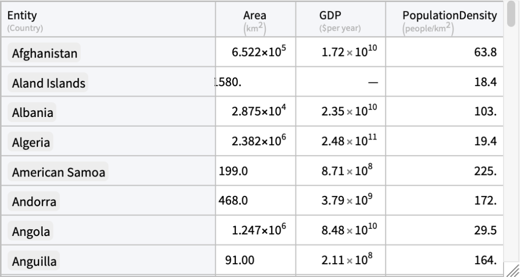 data = EntityValue["Country", {"Area", "GDP", "PopulationDensity"}, "Tabular"]