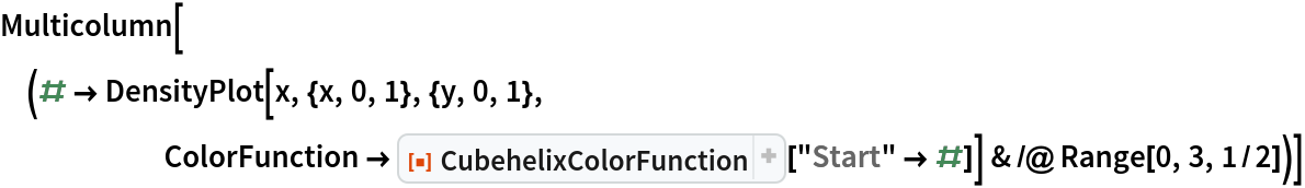 "Start" defines the starting hue of the color function, where 1 = red, 2 = green and 3 = blue. The default value (1/2) is purple.
