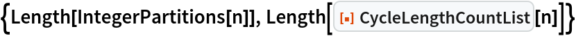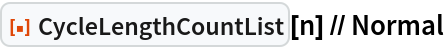 ResourceFunction["CycleLengthCountList"][n] returns a list of all possible cycle length counts that represent a partitioning of permutations of size n into disjoint cycles. |