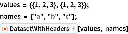 ResourceFunction["DatasetWithHeaders"][data] creates a dataset from tabular data, using the first row as column names. | |