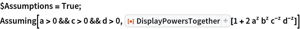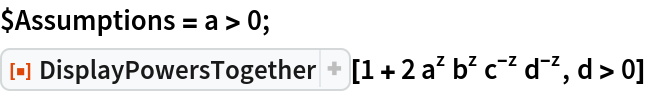 DisplayPowersTogether combines exponents using the default assumptions stored in $Assumptions. The assumptions in this example are sufficient to combine all the exponents: