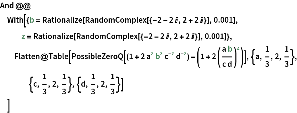 This performs independent verification by searching for a counterexample to the previous example. The identity is True in every case considered: