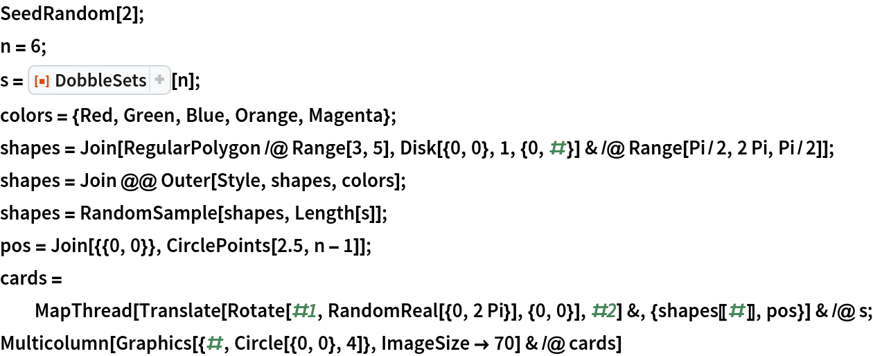 ResourceFunction["DobbleSets"][n] generates n2-n+1 sets, each with n numbers, where each pair of sets only has a single number in common. |