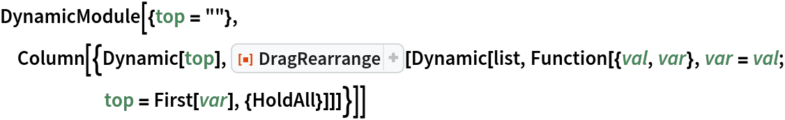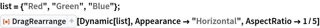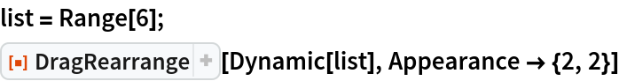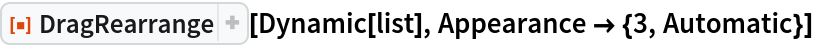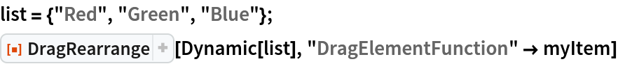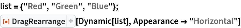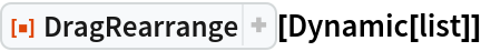 ResourceFunction["DragRearrange"][Dynamic[list]] creates a dynamic interface in which you can reorder the elements of list by dragging them with the mouse. |