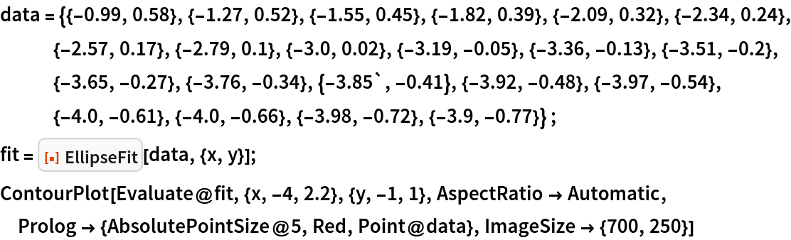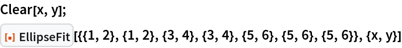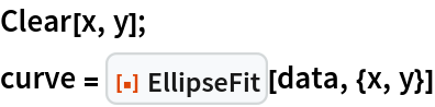 ResourceFunction["EllipseFit"][{{x1,y1},{x2,y2},…,{xn,yn}},{x,y}] returns an equation in x and y of an ellipse that fits the given 2D data. |