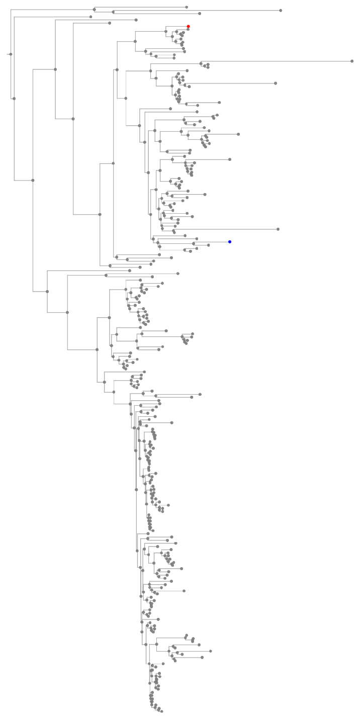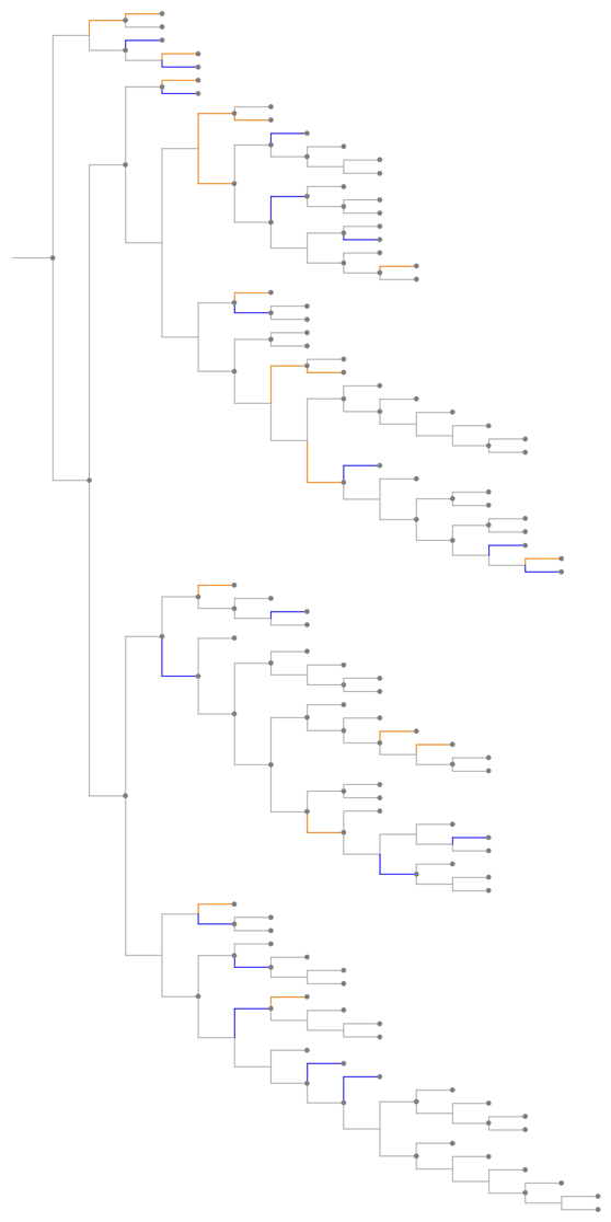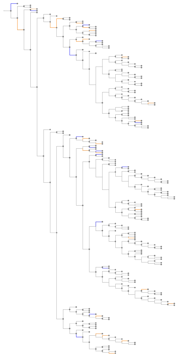 The "GeneGainLossTree" analyzes the evolution of the size of gene families over time. Significant gene gain events (expansions) are shown with orange branches and gene loss events (contractions) are shown with blue branches.