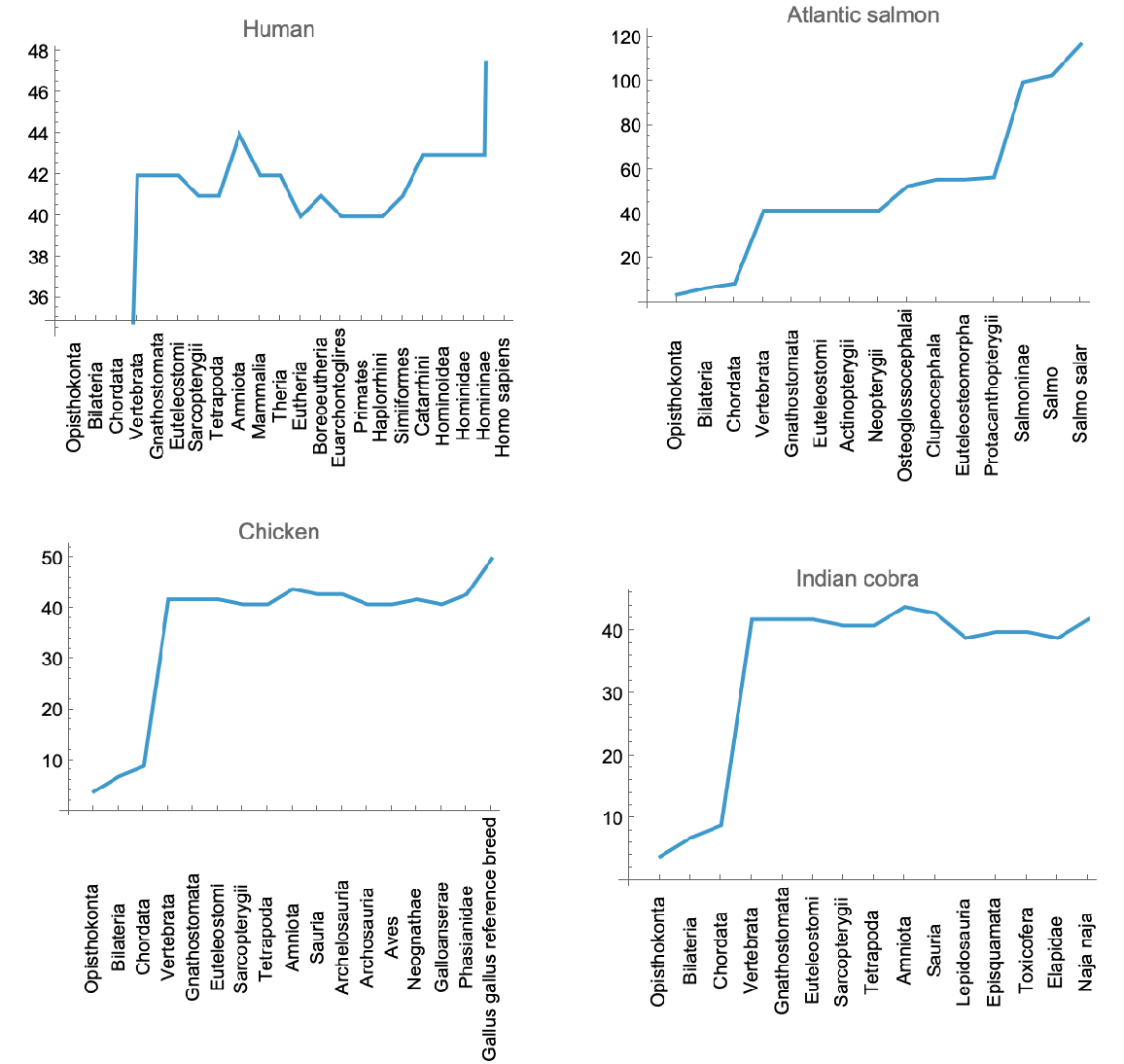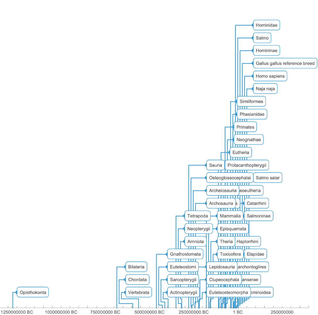 Nodes and branches of trees illustrate homologous genes of various species and their evolutionary relationships, respectively.