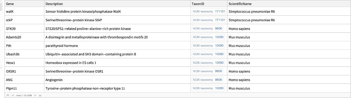 | "Species" | "human" | specified species to query result; selected TaxonomicSpecies entities or names of species are used |