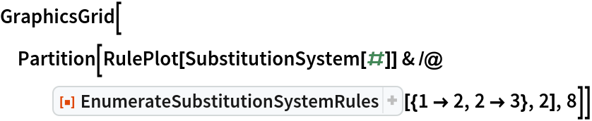"EnumerateSubstitutionSystemRules"][{1 -> 2, 2 -> 3}, 2], 8]]