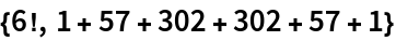 {6!, 1 + 57 + 302 + 302 + 57 + 1}
