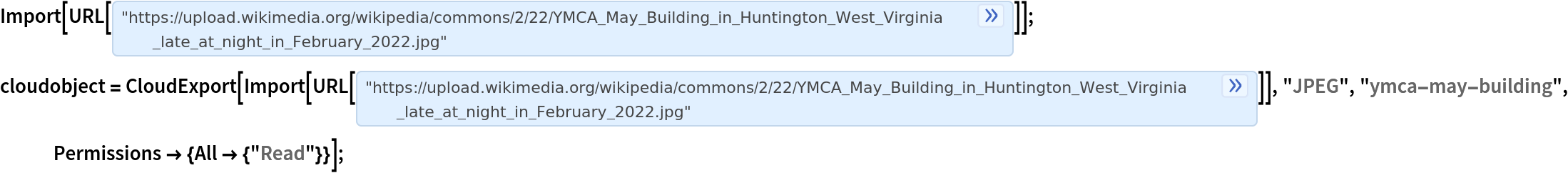 Import the image from Wikimedia Commons and export it to the Wolfram Cloud in the JPEG format with the URL ymca-may-building: