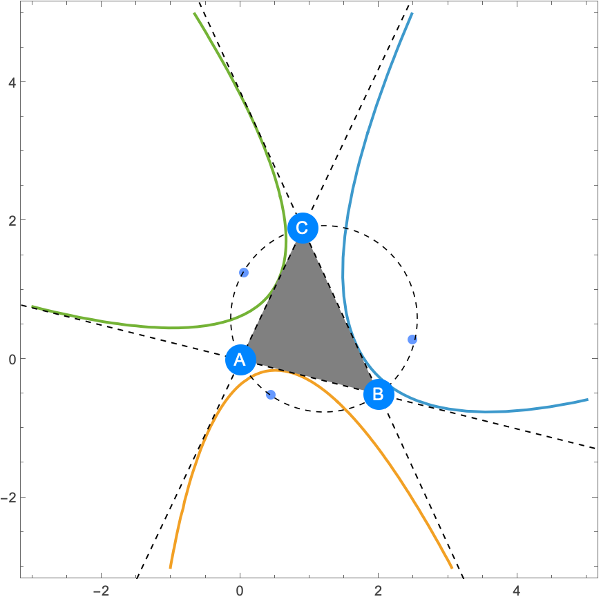 Given a triangle A1A2A3, the returned parabolas are ordered such that the parabola with the internal contact point on the opposite side of A1 comes first, that of A2 comes the second and that of A3 comes the last.