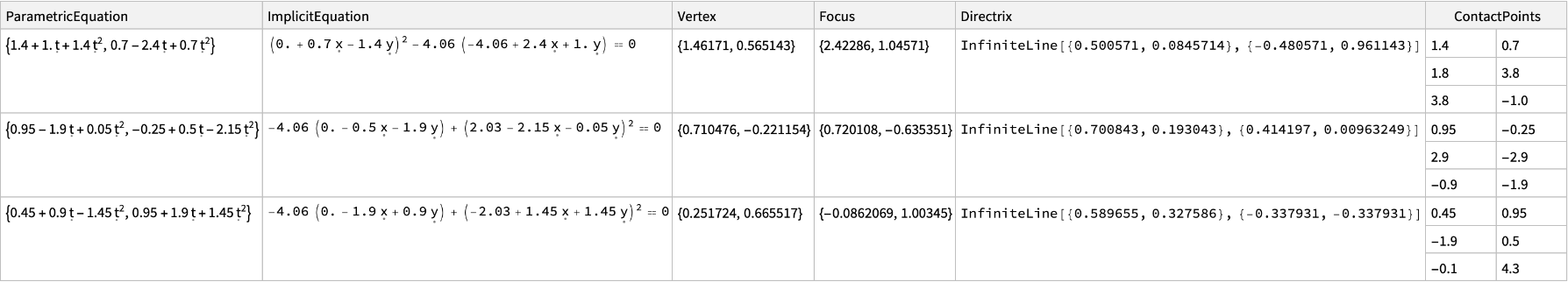 | "ImplicitEquation" | The implicit equation for the parabola in terms of x and y |