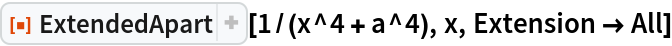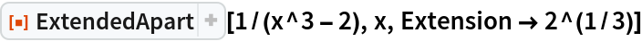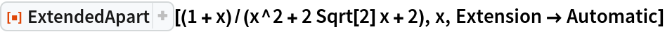 ResourceFunction["ExtendedApart"][exp,var,Extension→{a1,a2,…}] allows coefficients that are rational combinations of the algebraic numbers ai. |