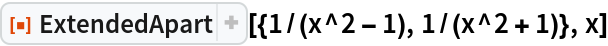 ResourceFunction["ExtendedApart"][exp,var] rewrites a rational expression as a sum of terms with minimal degree denominators in the complex domain, treating all variables other than var as constants. | |