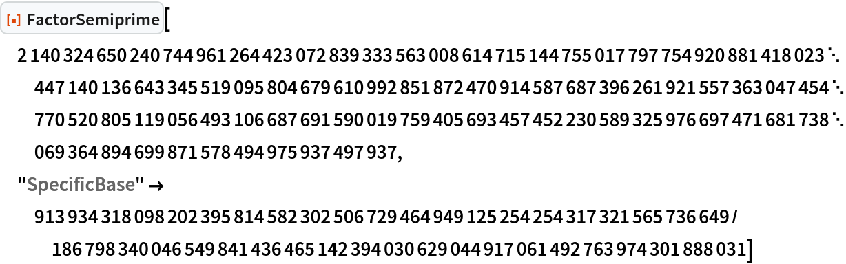Similar to trial division, which tests successive odd integers for divisibility, ResourceFunction["FactorSemiprime"] exhaustively tests each possible a/b-rational base representation of p in lexicographic order. That is, a/b=2,3,4,3/2,5,6,5/2,4/3,7,5/3,…