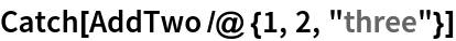 Catch[AddTwo /@ {1, 2, "three"}]