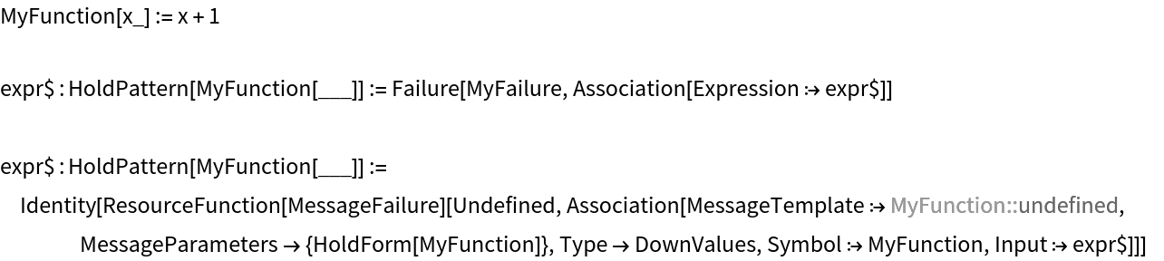 expr$ : HoldPattern[MyFunction[___]] := Failure["MyFailure", <|"Expression" :> expr$|>];