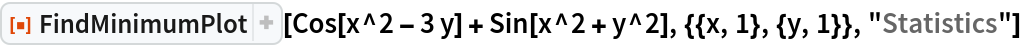 "FindMinimumPlot"][(x^2 - 3 y)^2 + Sin[x^2 + y^2]^2, {{x, 1}, {y, 1}}, ColorFunction -> "M10DefaultDensityGradient"]