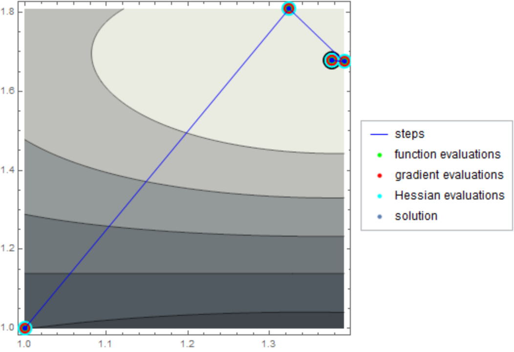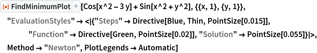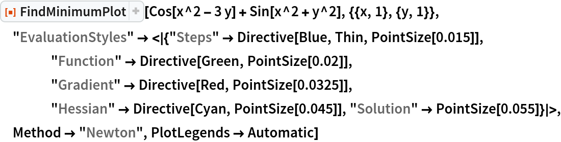 Cos[x^2 - 3 y] + Sin[x^2 + y^2], {{x, 1}, {y, 1}}, "EvaluationStyles" -> <|{"Steps" -> Directive[Blue, Thin, PointSize[0.015]], "Function" -> Directive[Green, PointSize[0.02]], "Gradient" -> Directive[Red, PointSize[0.0325]], "Hessian" -> Directive[Cyan, PointSize[0.045]], "Solution" -> PointSize[0.055]}|>, Method -> "Newton", PlotLegends -> Automatic]