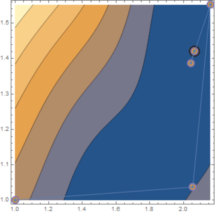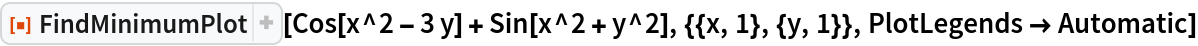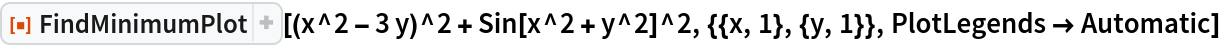 "FindMinimumPlot"][(x^2 - 3 y)^2 + Sin[x^2 + y^2]^2, {{x, 1}, {y, 1}}, PlotLegends -> Automatic]