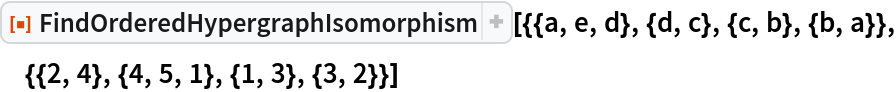 ResourceFunction["FindOrderedHypergraphIsomorphism"][h1,h2] finds all possible isomorphisms that map the ordered hypergraph h1 to h2 by renaming vertices. |
