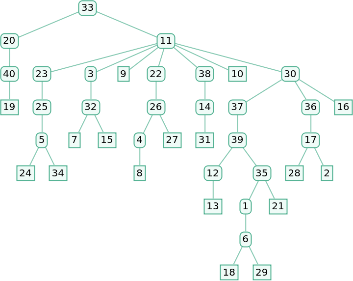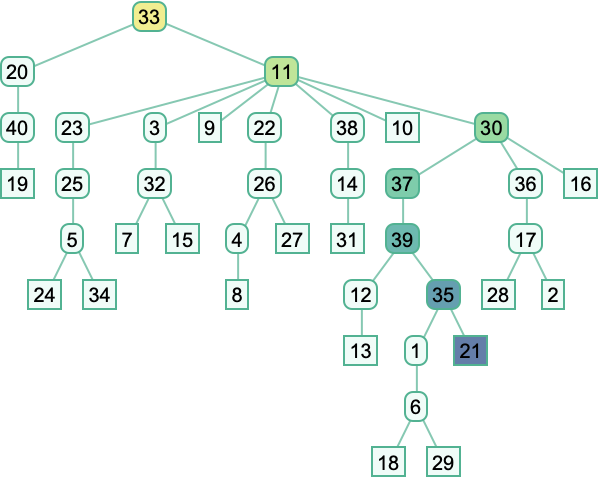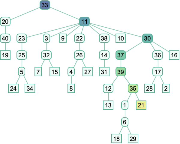 Obtain a list of all positions on tree and all paths starting from node with value 33:
