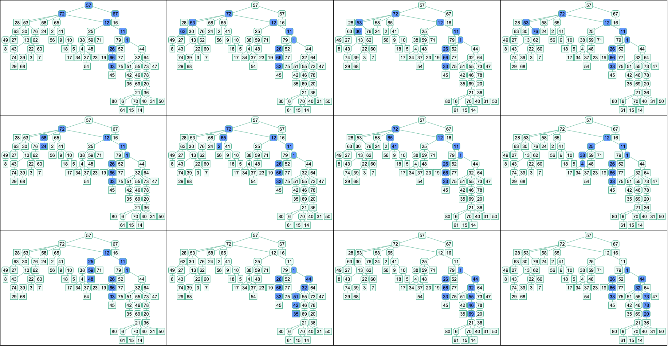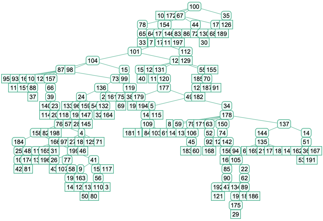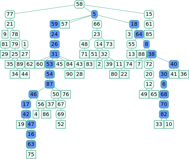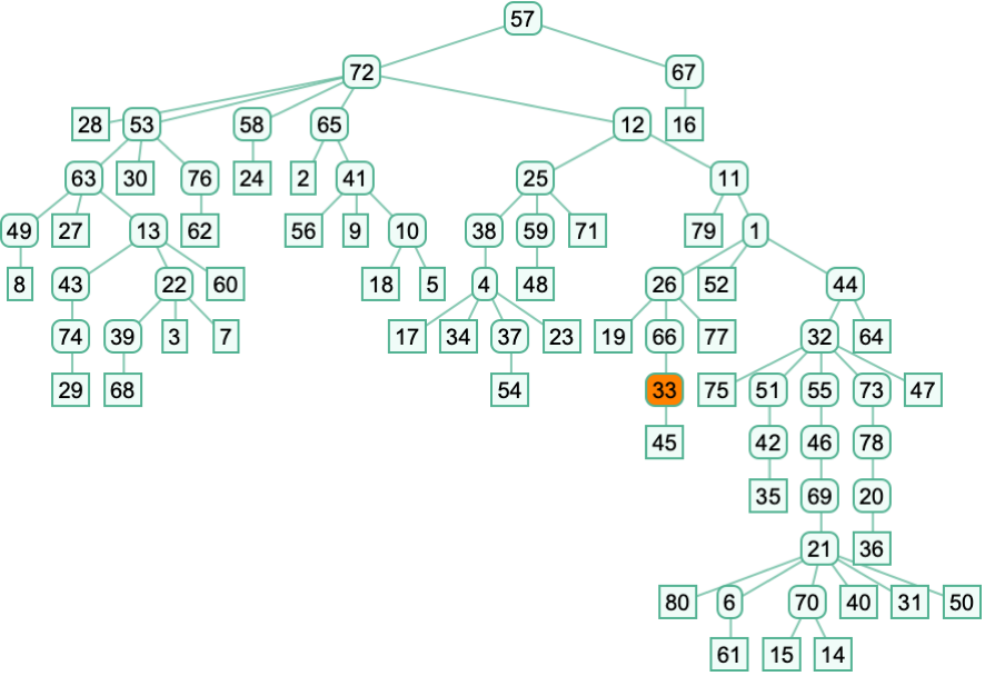 Visualize the path that connects the given nodes labeled 63 and 82 on the given tree: