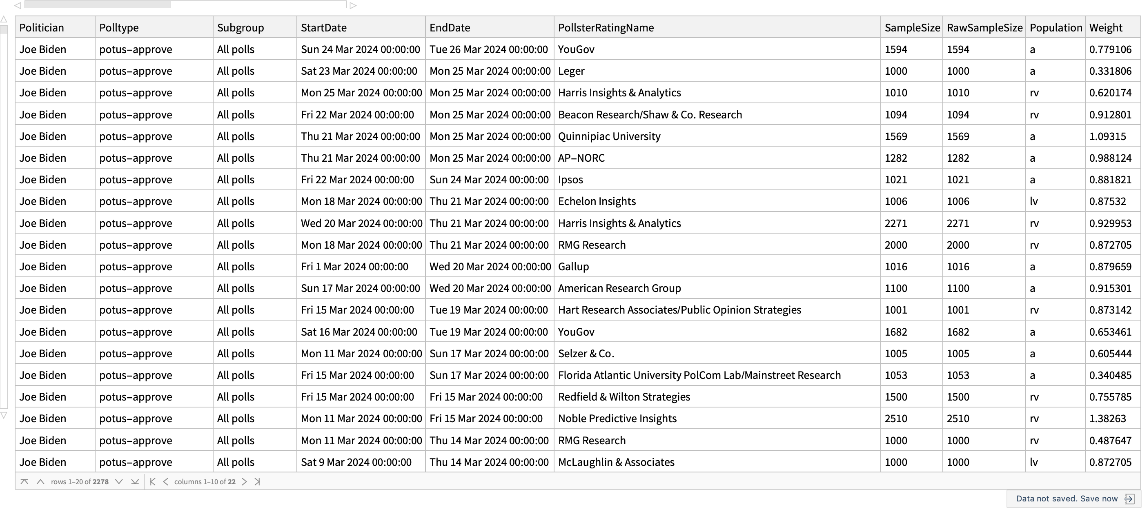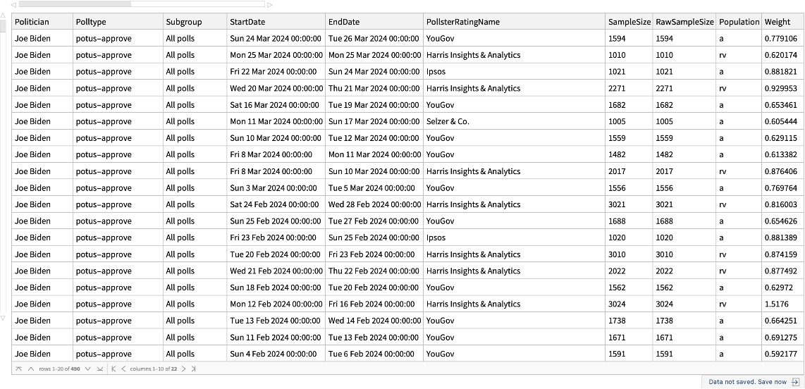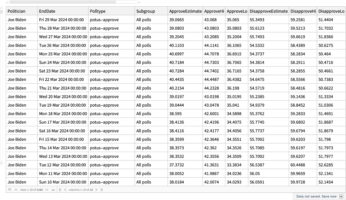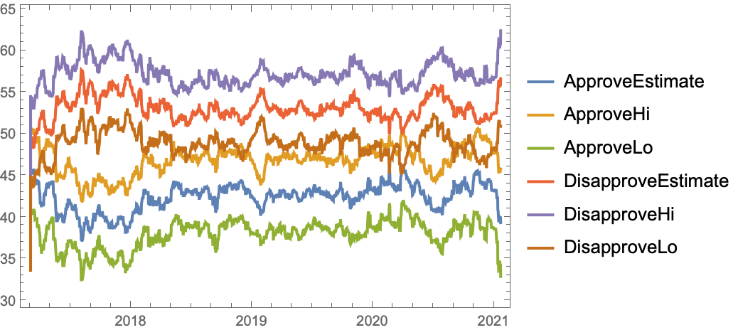 ResourceFunction["FiveThirtyEightPresidentialApproval"][pres] gives approval rating data from fivethirtyeight.com for the US president pres. | |