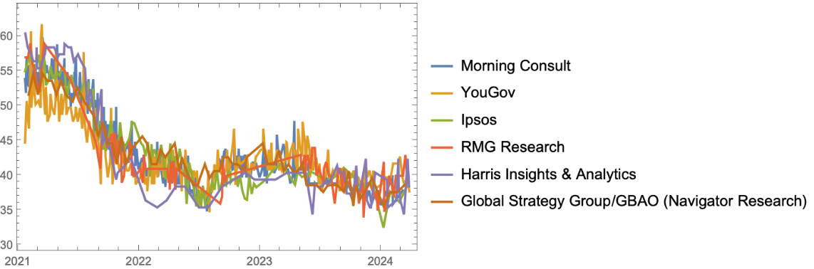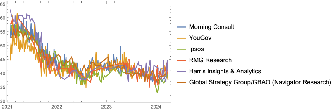 Plot timelines for approval values for the six most common pollsters over time: