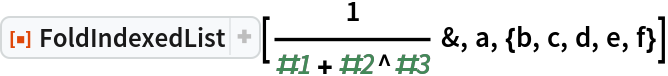 ResourceFunction["FoldIndexedList"][f,{a,b,c,…}] gives {a,f[a,b,1],f[f[a,b,1],c,2]}. | |