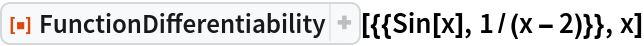 ResourceFunction["FunctionDifferentiability"][{{f1,f2,…}},x] returns the conditions for which the functions {f1,f2,…} are all differentiable with respect to x. |